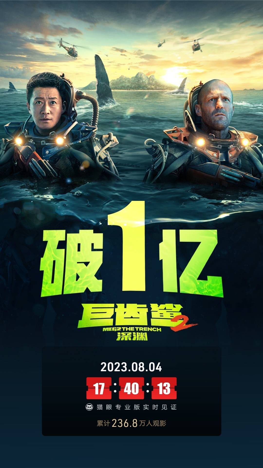 搜狐娱乐讯 据猫眼专业版数据,截至8月4日17时40分,杰森·斯坦森、吴京主演动作惊悚片续集《巨齿鲨2:深渊》上映首日,累计票房突破1亿。