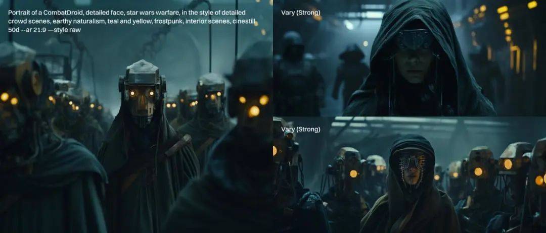 “星球大战、风格为精细的人群场景、朴实的自然主义、青色和黄色、寒霜朋克、室内场景、cinestill 50d—ar 21:9— 原始风格”。