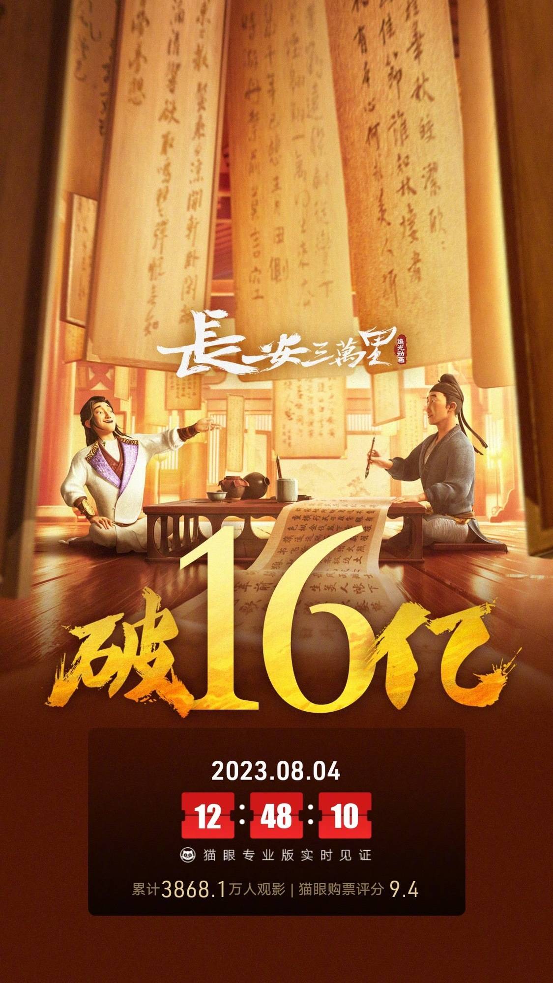 搜狐娱乐讯 据猫眼专业版数据,截至8月4日12:48,追光动画“新文化”系列开篇之作电影《长安三万里》上映第28天,累计票房突破16亿,暂居中国影史动画电影票房第三,即将超越排名第二的《姜子牙》(16.02亿)。
