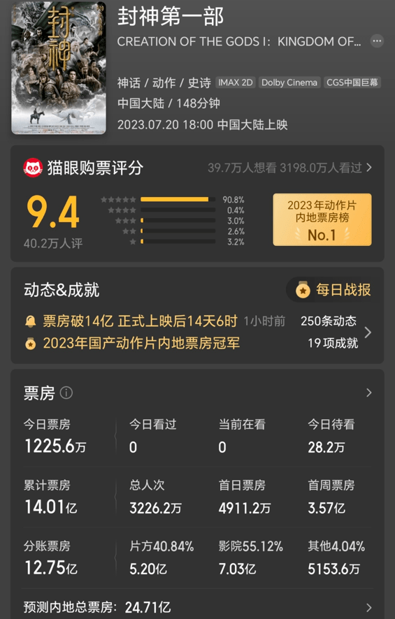 搜狐娱乐讯 (哈麦/文)截止8月4日,《封神第一部》上映第16天,累计总票房突破了14亿元,场均人次一直排在第一,猫眼专业版预测其预计最终总票房将奔25亿元。