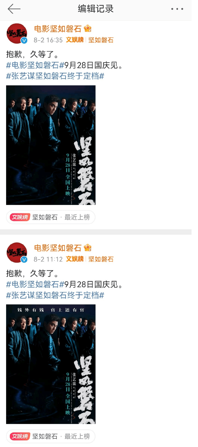原本电影官宣时,官方社交平台和主演转发的海报上,都有“钱外有钱 官上还有官”这句slogan。然而发布之后没多久,均更换素材,换成了没有这句话的海报,很显然是发布之后遇到了阻力,不得不更换物料。像《坚如磐石》这样刚官宣就被“河蟹”也算活久见了。