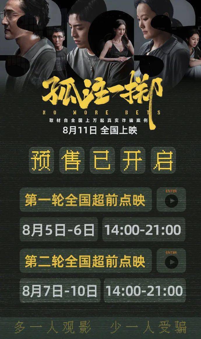 由宁浩监制、申奥导演的电影《孤注一掷》宣布开启二轮点映,继本周末开启全国点映,将于8月7日-8月10日14:00-21:00持续全国点映。电影将于8月11日全国上映。