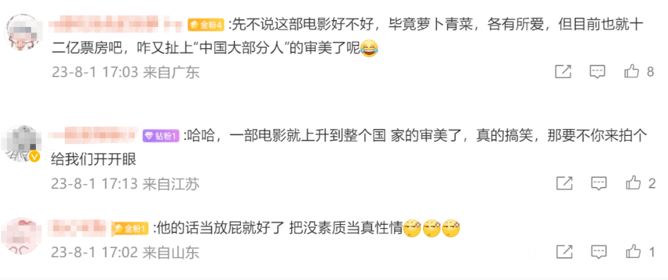 更过分的是,王思聪从这部电影上升到国人的审美,评论大部分中国人失去了审美能力,是一种可悲。