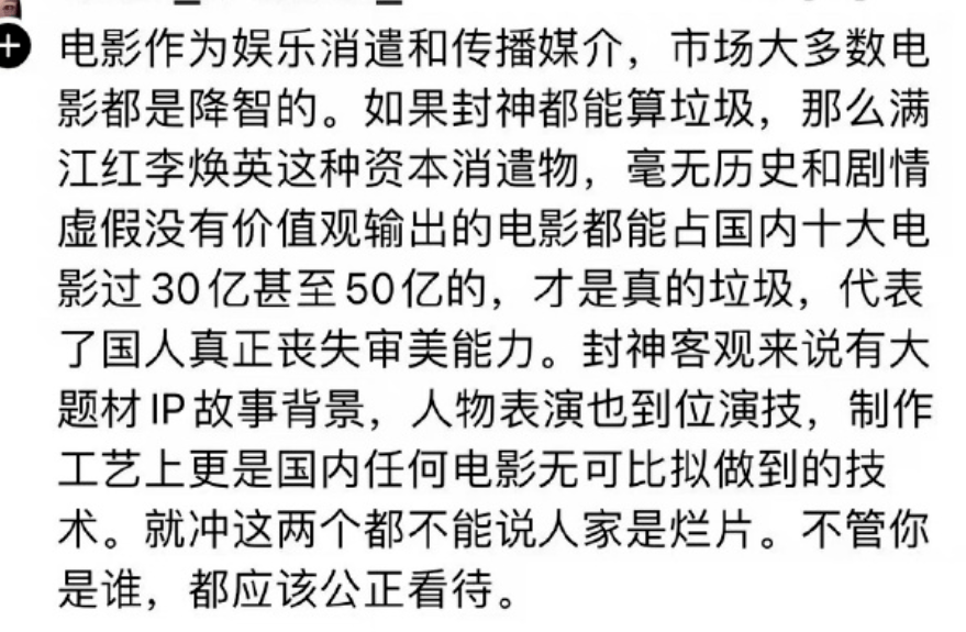 但不管《封神》的质量如何,电影本来就是雅俗共赏的艺术,一部口碑再好的电影可能都会有人不喜欢,网友们有喜欢和不喜欢的权利,但像王思聪这样把对这部电影的不喜欢上升到骂国人的审美,似乎就不妥当了。