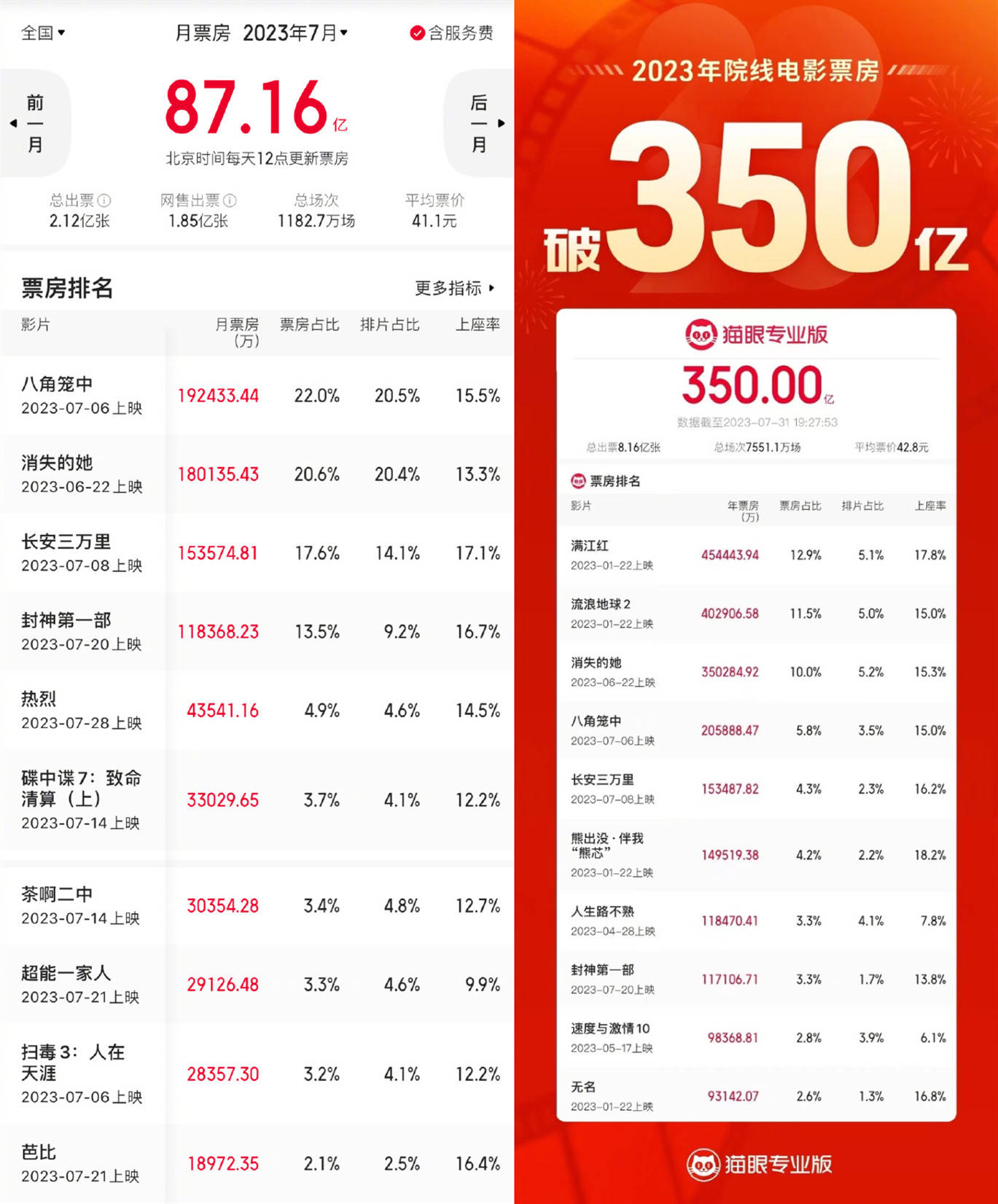 搜狐娱乐讯 据猫眼专业版数据,2023年7月全国电影票房报收87.16亿,将2018年7月保持的同期最高纪录(69.66亿)大幅提升25%,同时超过2019年10月国庆档(83.16亿),刷新除春节档之外单月最高票房成绩。截至7月31日24时,2023年度电影总票房也已突破350亿。