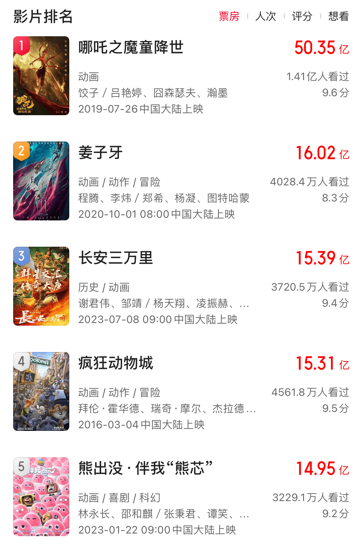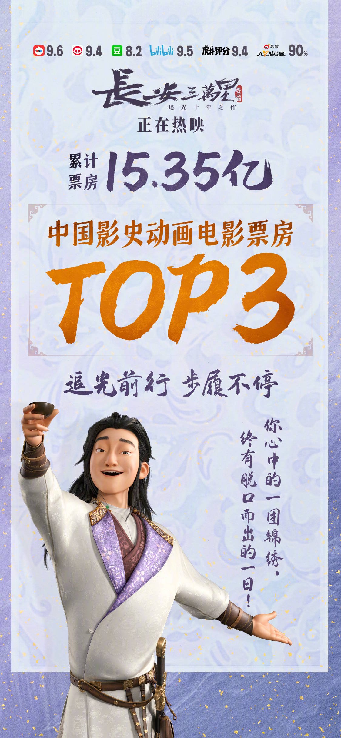 原标题:电影《长安三万里》累计票房达15.39亿 跻身中国影史动画电影票房榜前三