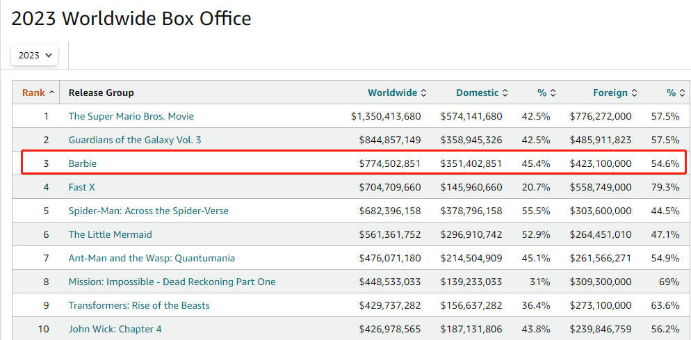 搜狐娱乐讯 格蕾塔·葛韦格执导,玛格特·罗比、瑞恩·高斯林主演的真人电影《芭比》上映10天,全球总票房突破7.745亿美元(约合人民币55.328亿元),超《速度与激情10》跻身2023年全球票房榜前三。目前排名第一、第二的分别为《超级马里欧兄弟大电影》和《银河护卫队3》。