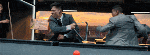 随后,又踢出台球,纵身一跃,以台球为子弹,击倒远处对手。