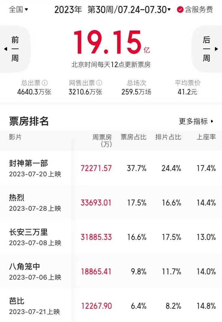 原标题:7.24-7.30内地一周票房19.15亿 《封神》7.22亿逆袭夺冠累计11亿 《热烈》居亚
