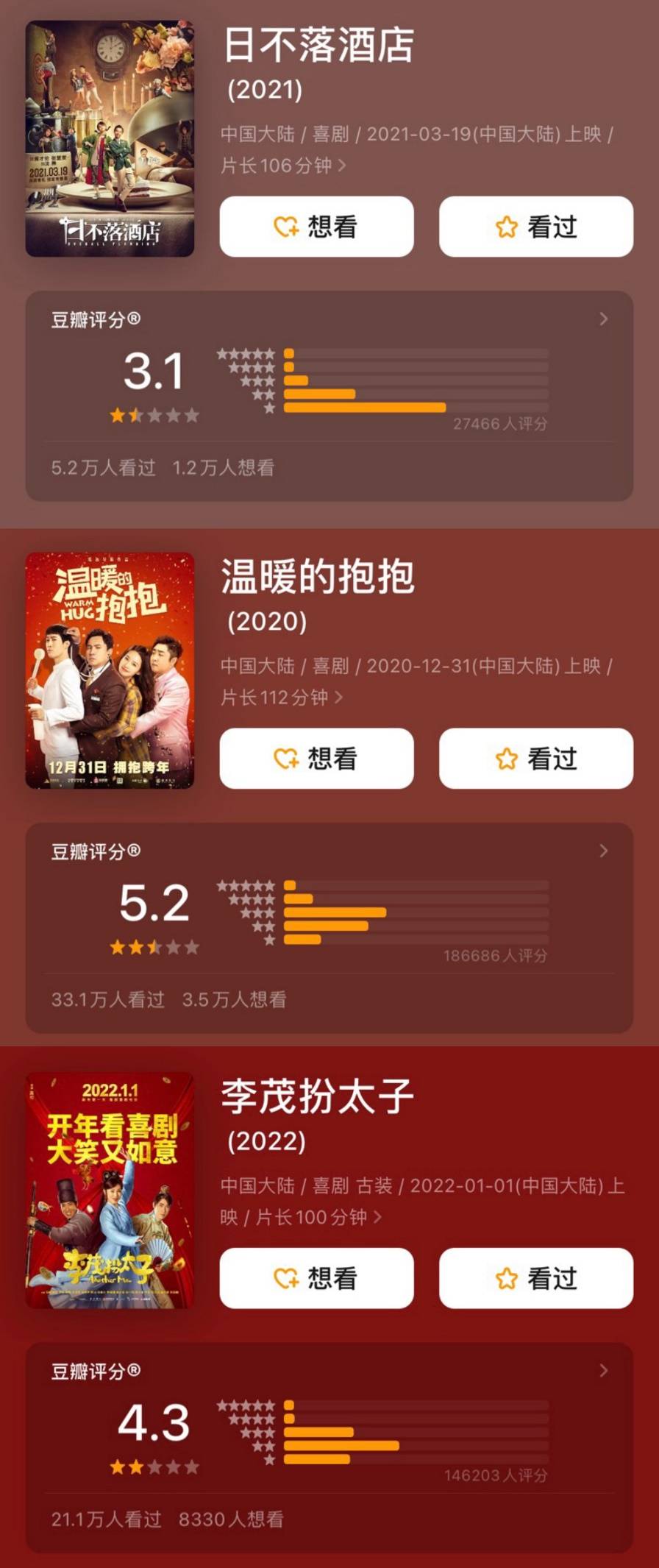 《日不落酒店》《温暖的抱抱》《李茂扮太子》,这些豆瓣平均4.2分的作品不算严格意义上的麻花电影。投资出品方中没有开心麻花,他们只提供艺人。