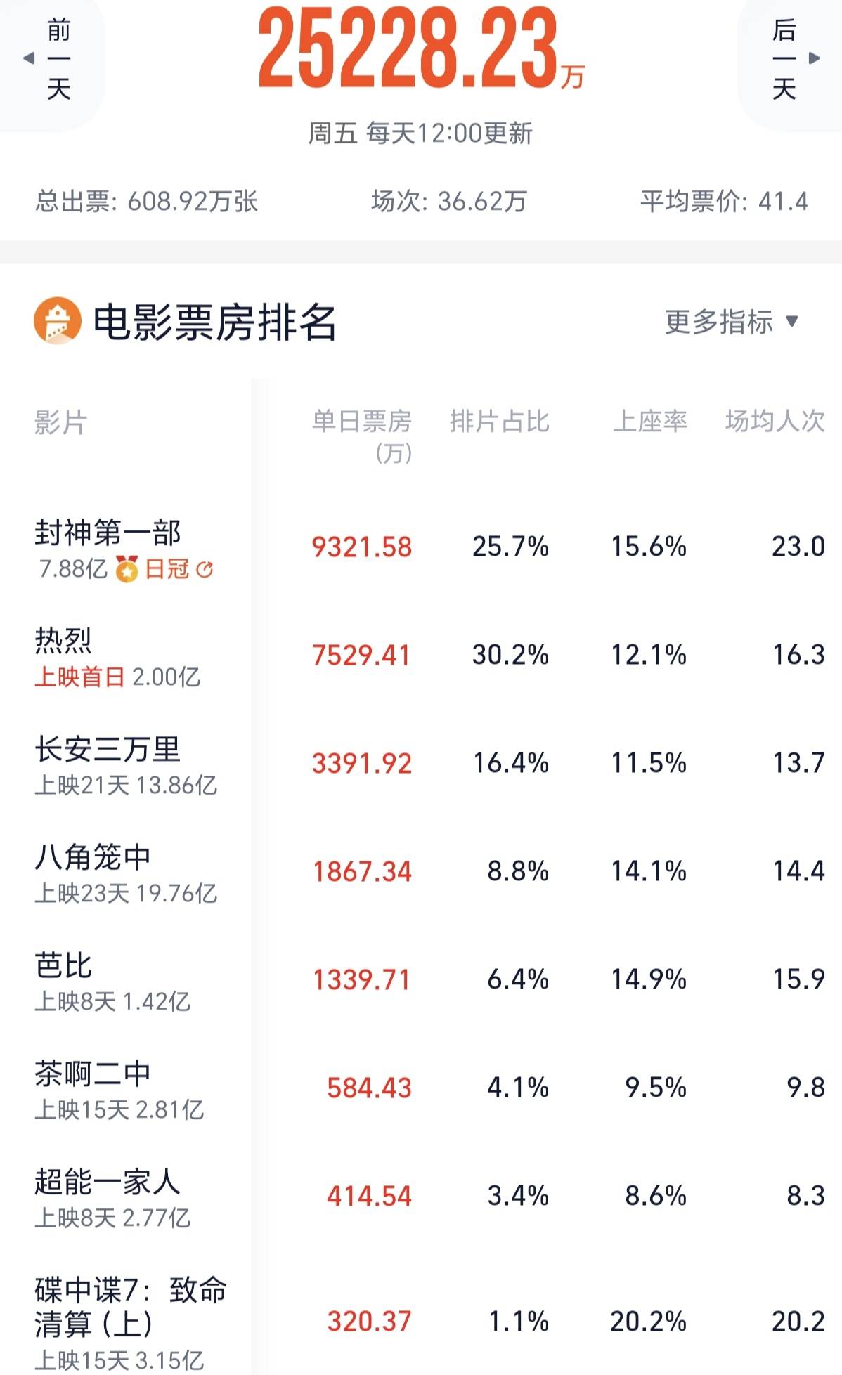 《热烈》的上座率不高,只有约12%,赶不上老片《碟中谍7》《封神第一部》《芭比》《八角笼中》,场均人次也在排在《封神》和《碟中谍7》之后。