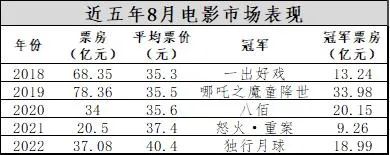 根据最近五年的8月市场大盘数据,目前表现最佳的一年是2019年8月的78.36亿元,这也是中国影史最佳八月成绩。而在这一个月中,仅《哪吒之魔童降世》一部影片就贡献了近34亿元的票房成绩。