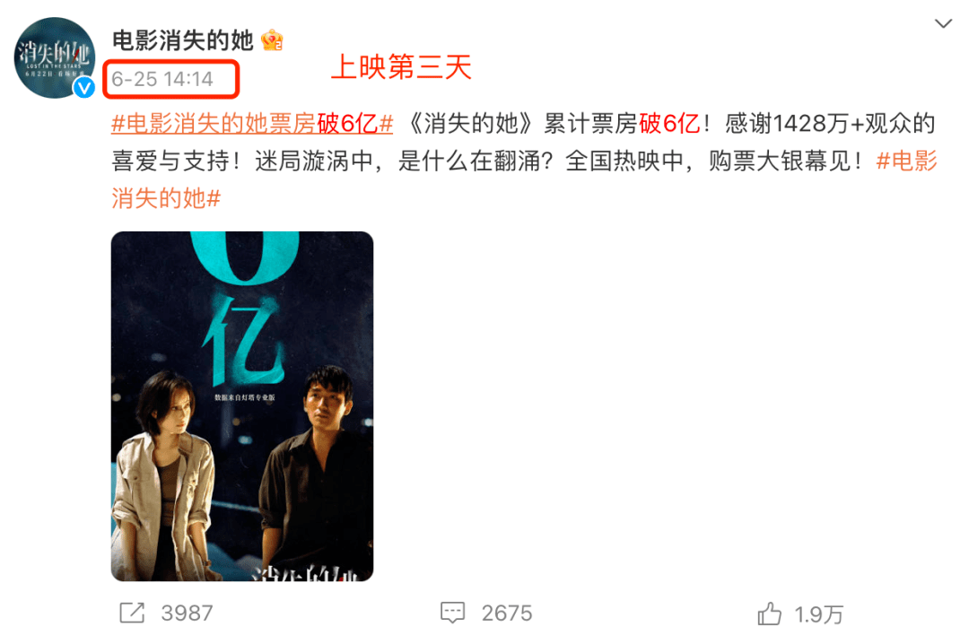以电影《消失的她》为例,目前该片票房为34.8亿,电影在上映的第三天,票房就破了6亿。
