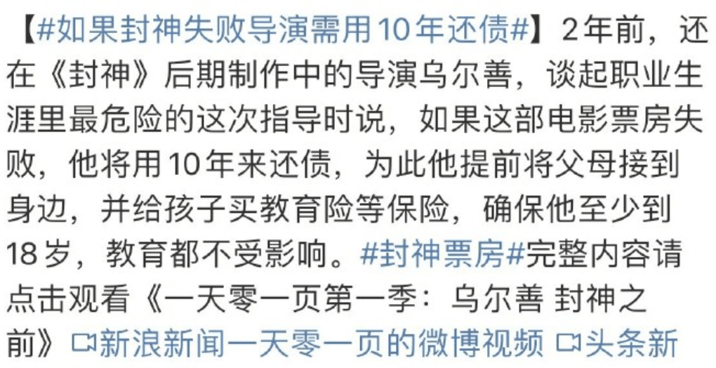 之后,乌尔善导演又说,《封神》是自己职业生涯最危险的一次执导,如果失败了,将用10年来还债。然后该词条又被刷上了热搜。
