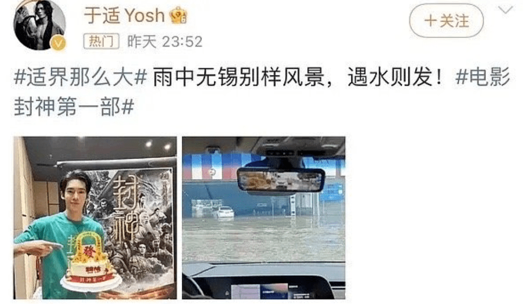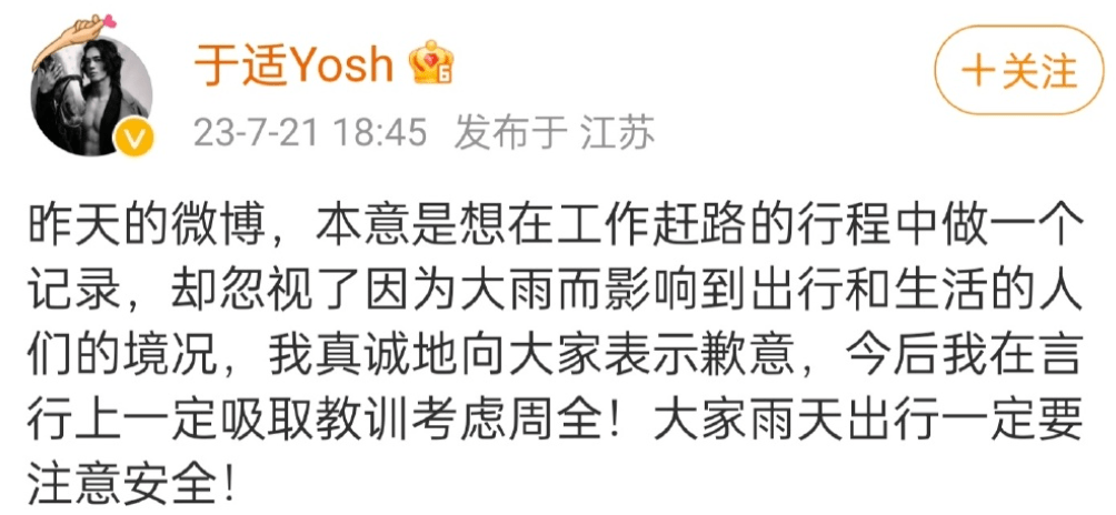 之后,在江苏遭遇暴雨侵袭时,身在无锡的于适发文称:遇水则发。