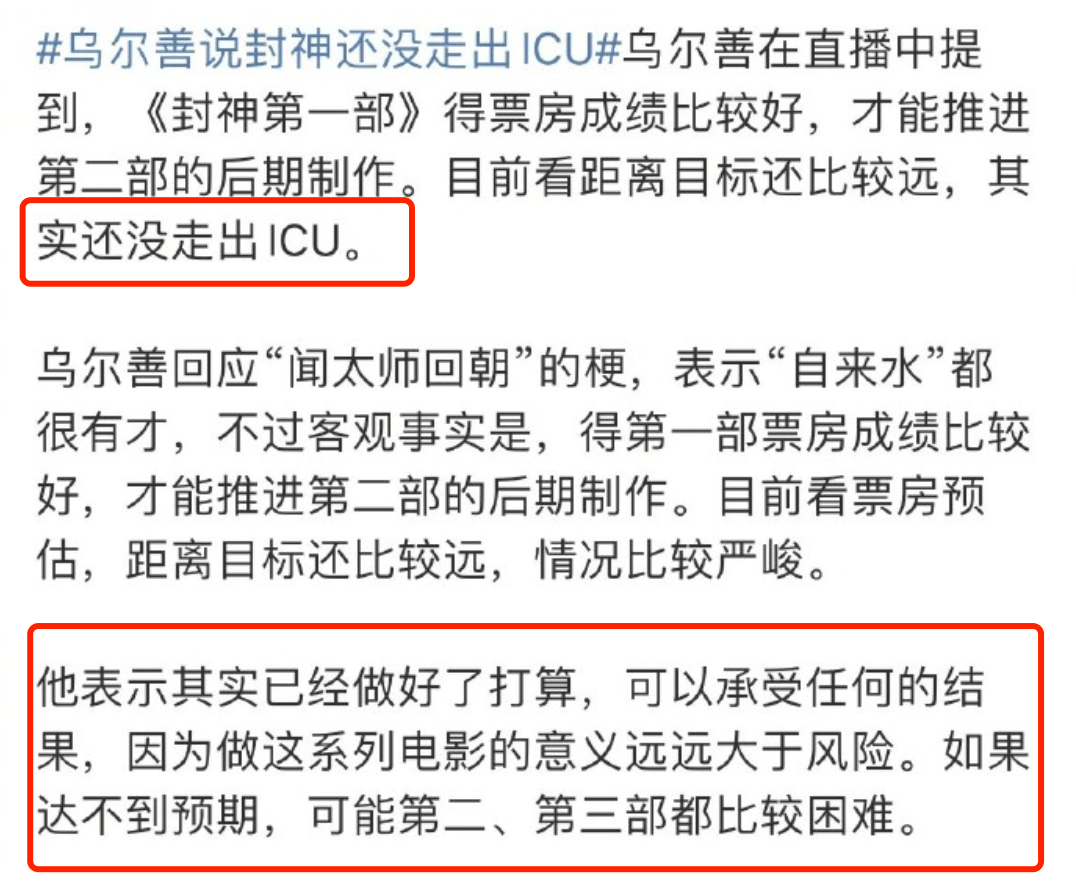 他在接受采访时说,《封神》现在还在ICU,也就是票房很危急,如果出不了ICU,那么观众大概率看不到《封神》二三部了。