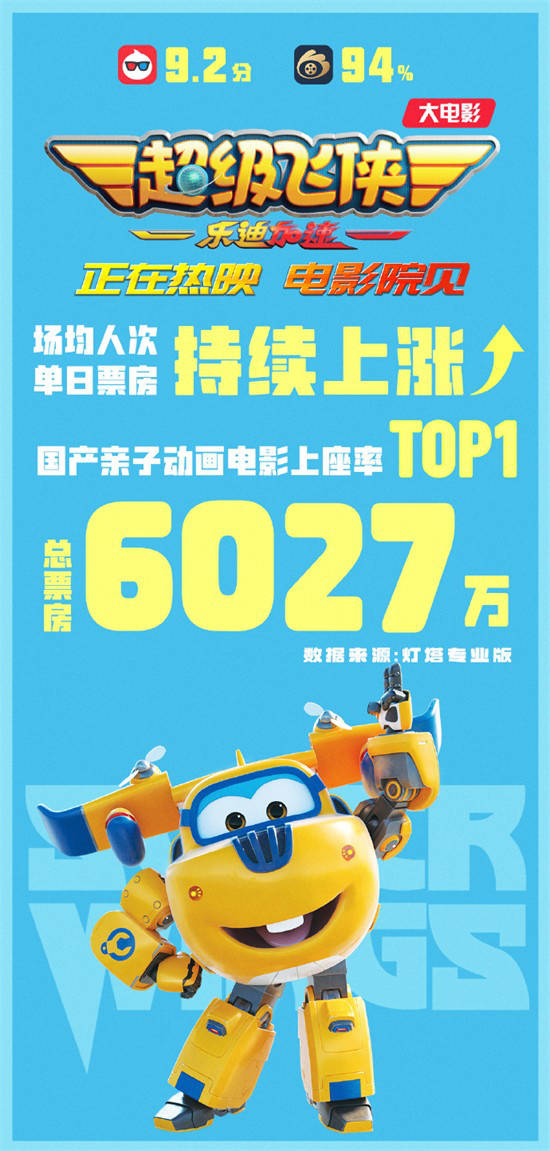 截至目前,《超级飞侠:乐迪加速》总票房已超过6000万,成为2023年暑期档国产亲子动画电影票房冠军。