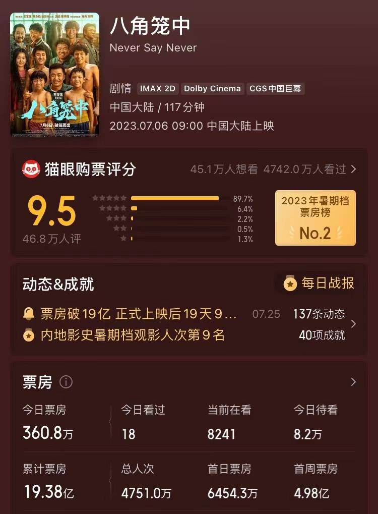 据猫眼专业版数据显示,截至目前,影片上映22天,累计票房已达19.38亿。