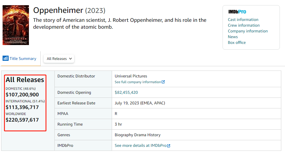 原标题:诺兰新片《奥本海默》上映5天北美票房破亿 全球累计超2.2亿美元