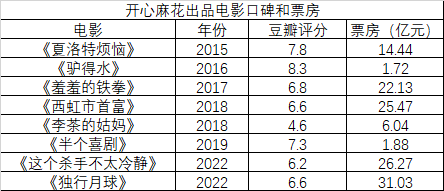 带着《夏洛特烦恼》和《驴得水》初入电影圈时,开心麻花被看成是一股新风。但出道即巅峰,后来的作品《羞羞的铁拳》《西虹市首富》《李茶的姑妈》《这个杀手不太冷静》《独行月球》虽然多数票房都不错,却没有一部在口碑上立得住,全都是豆瓣6.8分以下的水平。
