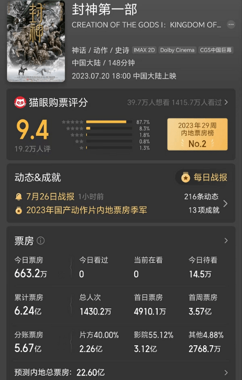 “自来水”的口碑效应是很有效的,《封神》上映第三天拿下了日冠,然后逐渐拉开了和《长安三万里》《超能一家人》的距离,上座率也逐日走好,站上第一,工作日票房稳在8000万元上下,7天累计破6亿,猫眼专业版将其最终预测总票房调高到了22.6亿元。