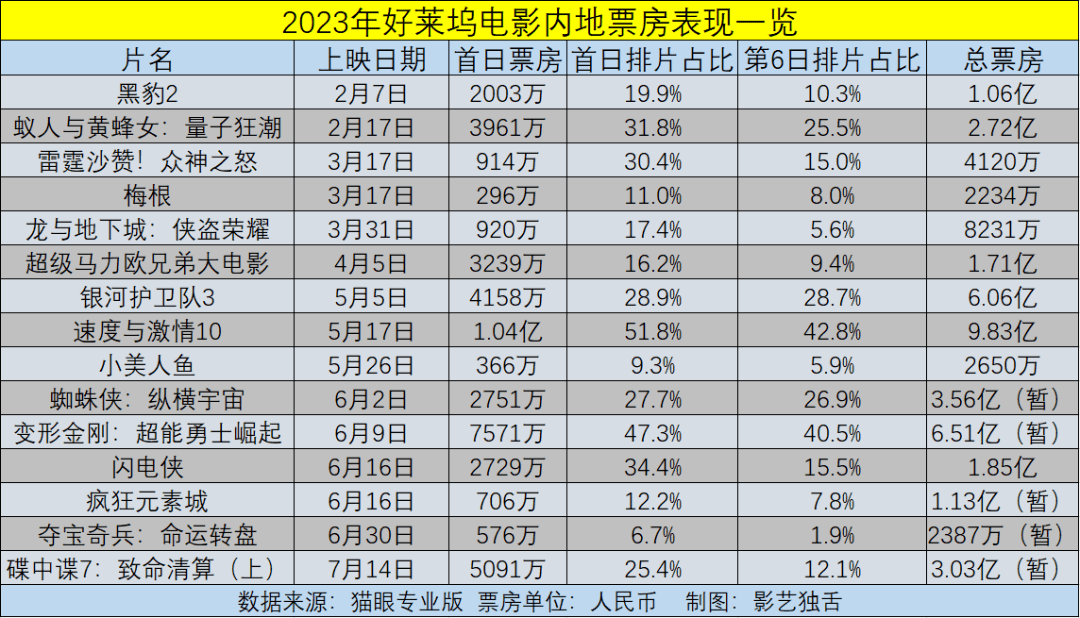 进入2023年,好莱坞电影在内地的卖座密码突然间集体失灵:《蚁人3》恢复中美同步上映,不灵;《超级马力欧兄弟大电影》改编自风靡全球的游戏IP,不灵;《蜘蛛侠:纵横宇宙》北美口碑炸裂,不灵;《夺宝奇兵5》重启老牌IP,不灵;《碟中谍7》拥有好莱坞最后一位超级巨星阿汤哥,不灵。