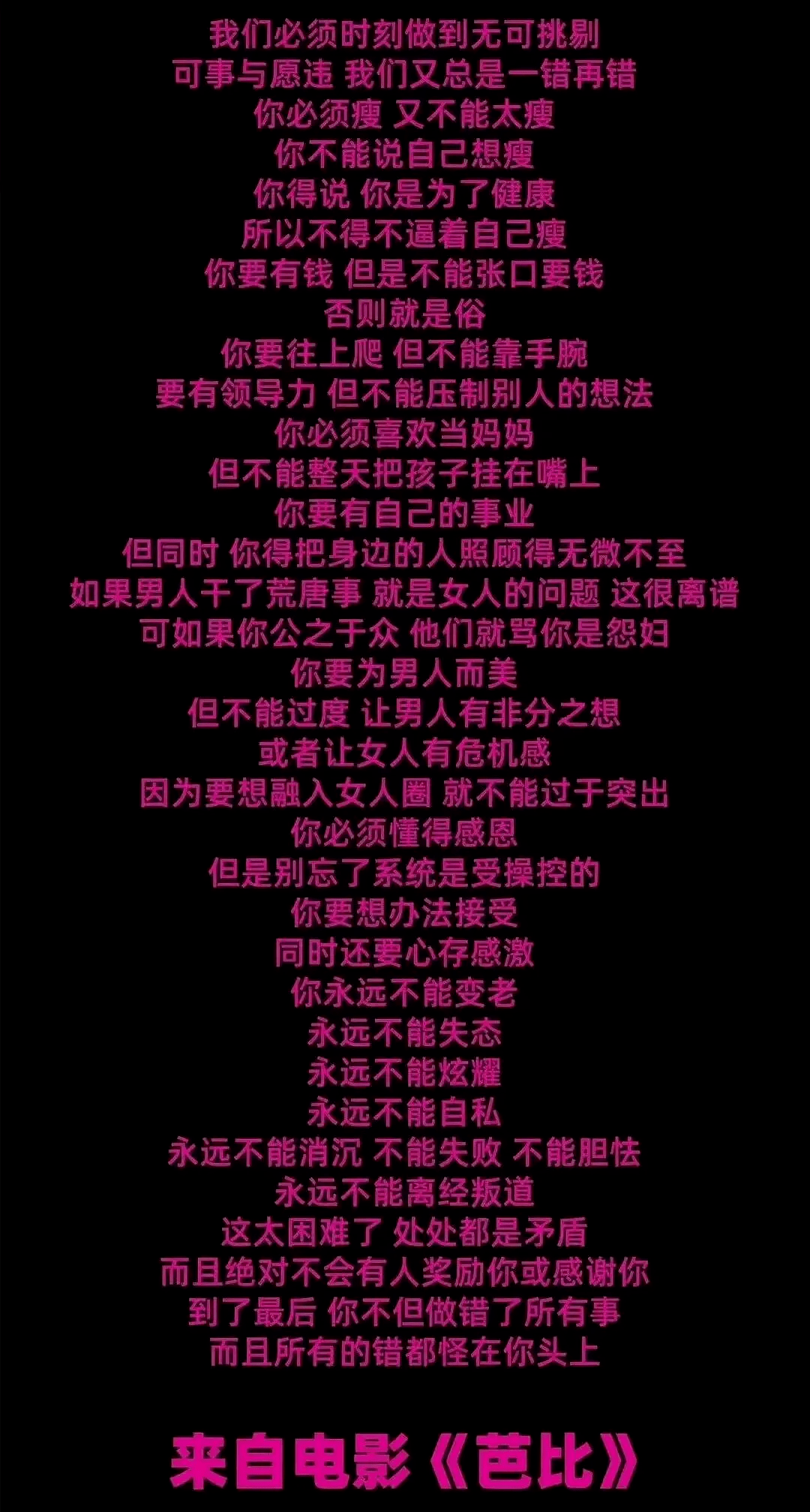 片中人类妈妈在芭比乐园里发表的一番吐槽,从拍摄水准上来讲,和影史经典的演说段落不可同日而语,但并不妨碍这段吐槽以文字和图片的形式在网络上成为万千女人的嘴替。
