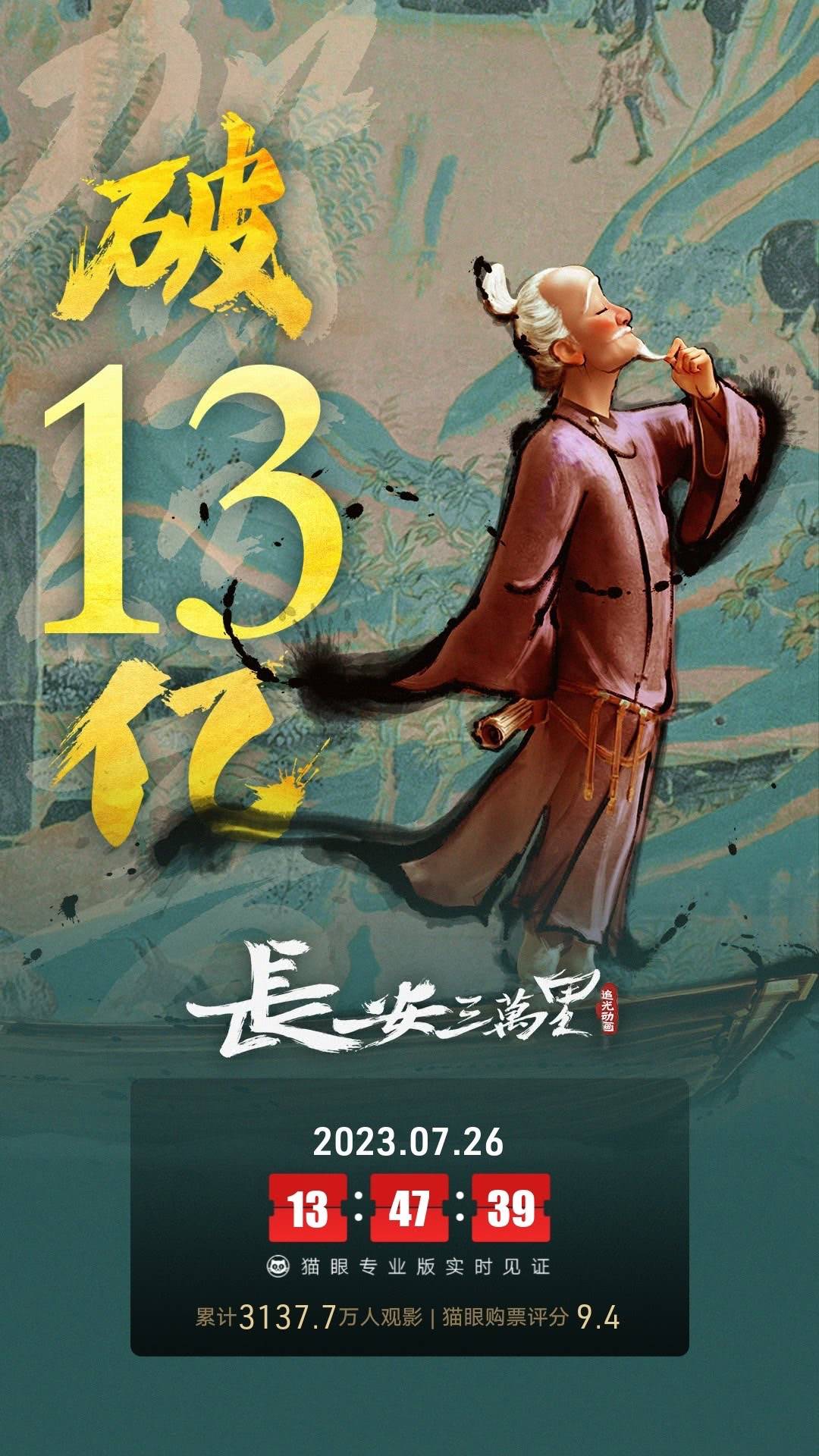 搜狐娱乐讯 据猫眼专业版数据,截至7月26日13:47,追光动画“新文化”系列开篇之作电影《长安三万里》上映第19天,累计票房破13亿。 暂居中国影史动画电影票房榜第五,2023年度内地电影票房榜第六。