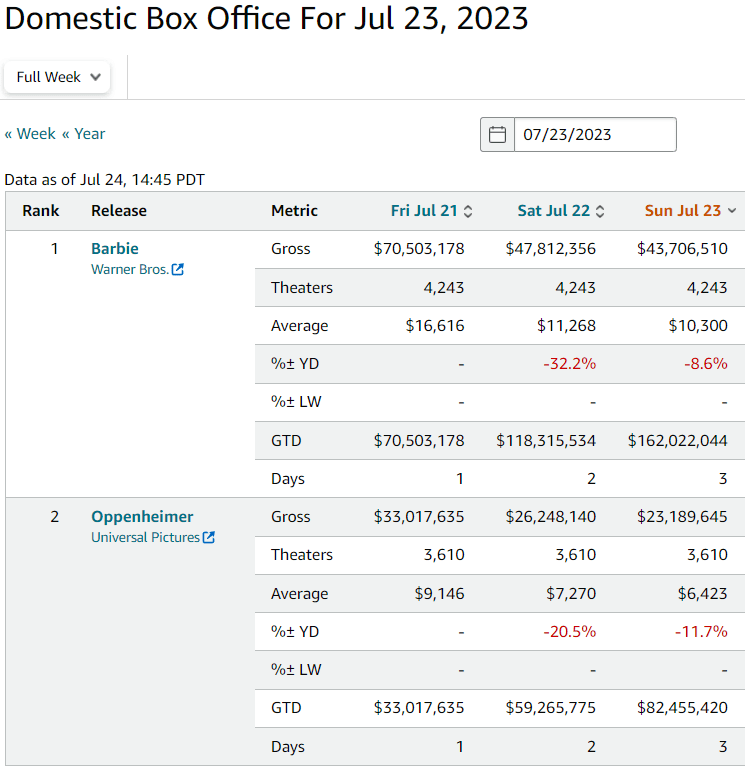 根据Box Office Mojo统计的数据,截止至7月23日,《芭比》的票房几乎是《奥本海默》的两倍。没想到,诺兰弃暗(华纳)投明(环球)后,华纳没有因此损失惨重,还开发出了《芭比》这部印钞机。