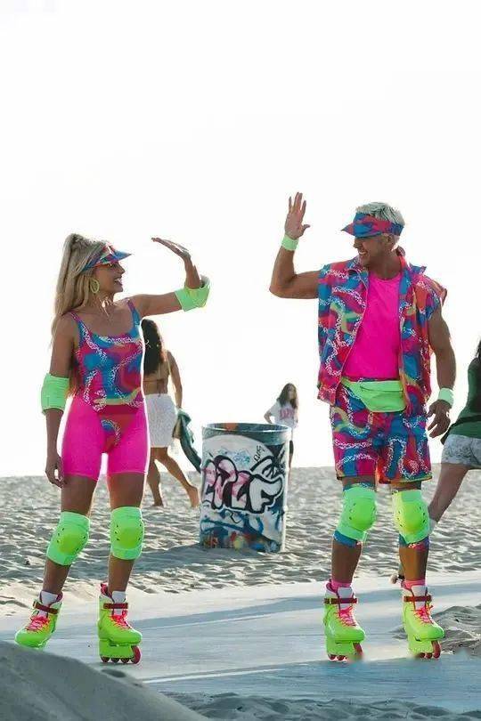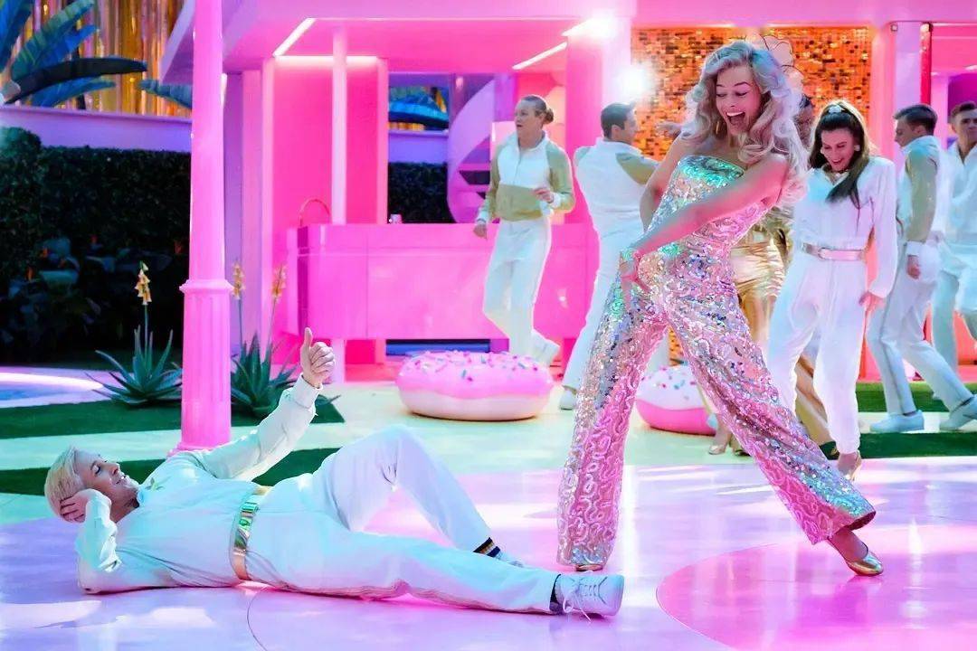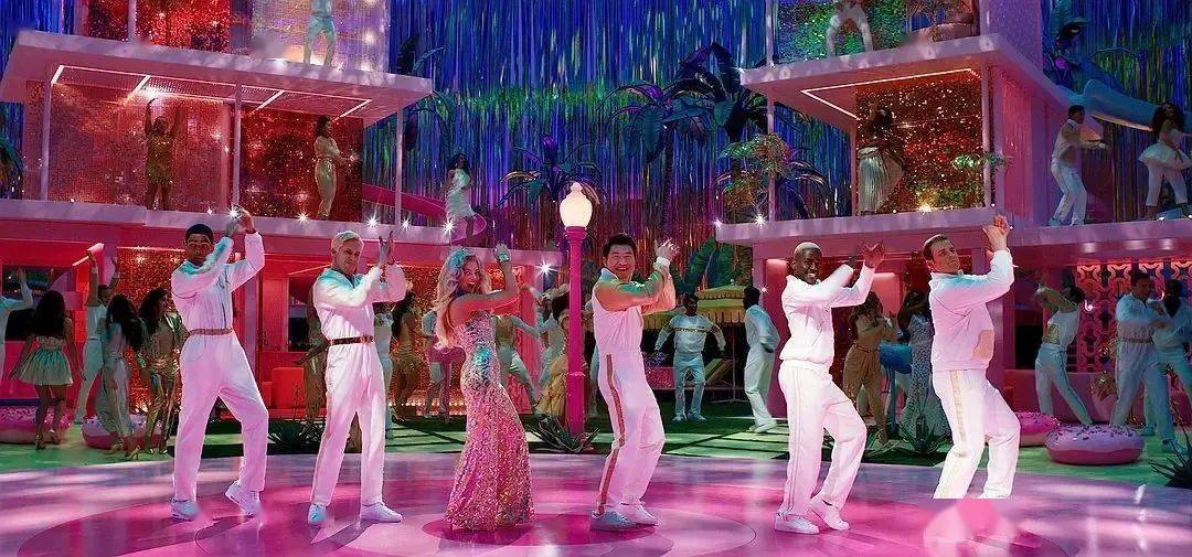 还是那个粉色的城堡,粉色的世界,梦幻的变装、绝美的芭比真人们轮番出场、乐园里等比例放大的房子和精致的配件,从视觉、画面和审美上给人超高的愉悦感。芭比粉是芭比娃娃也是该片的一种标志,本片的主要色调是粉色,即使是代表男性的角色肯也打扮得粉粉的,而在屏幕外的电影院,同样充满了粉色氛围,女孩们穿着粉粉的小裙子来看电影,成群结伴走进放映厅,屏幕外的女孩,也用自己的小小行动,为电影里的她欢呼鼓舞。