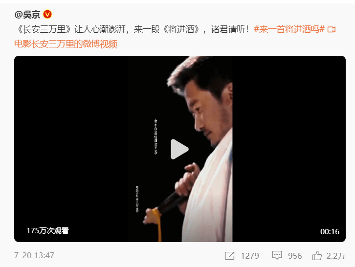 吴京看完电影后心潮澎湃,为此专门录了一段《将进酒》。