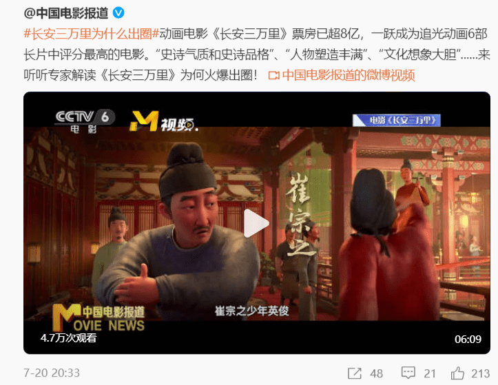 原标题:新华社7次点赞,人民日报、央视争相报道,《长安三万里》大爆了