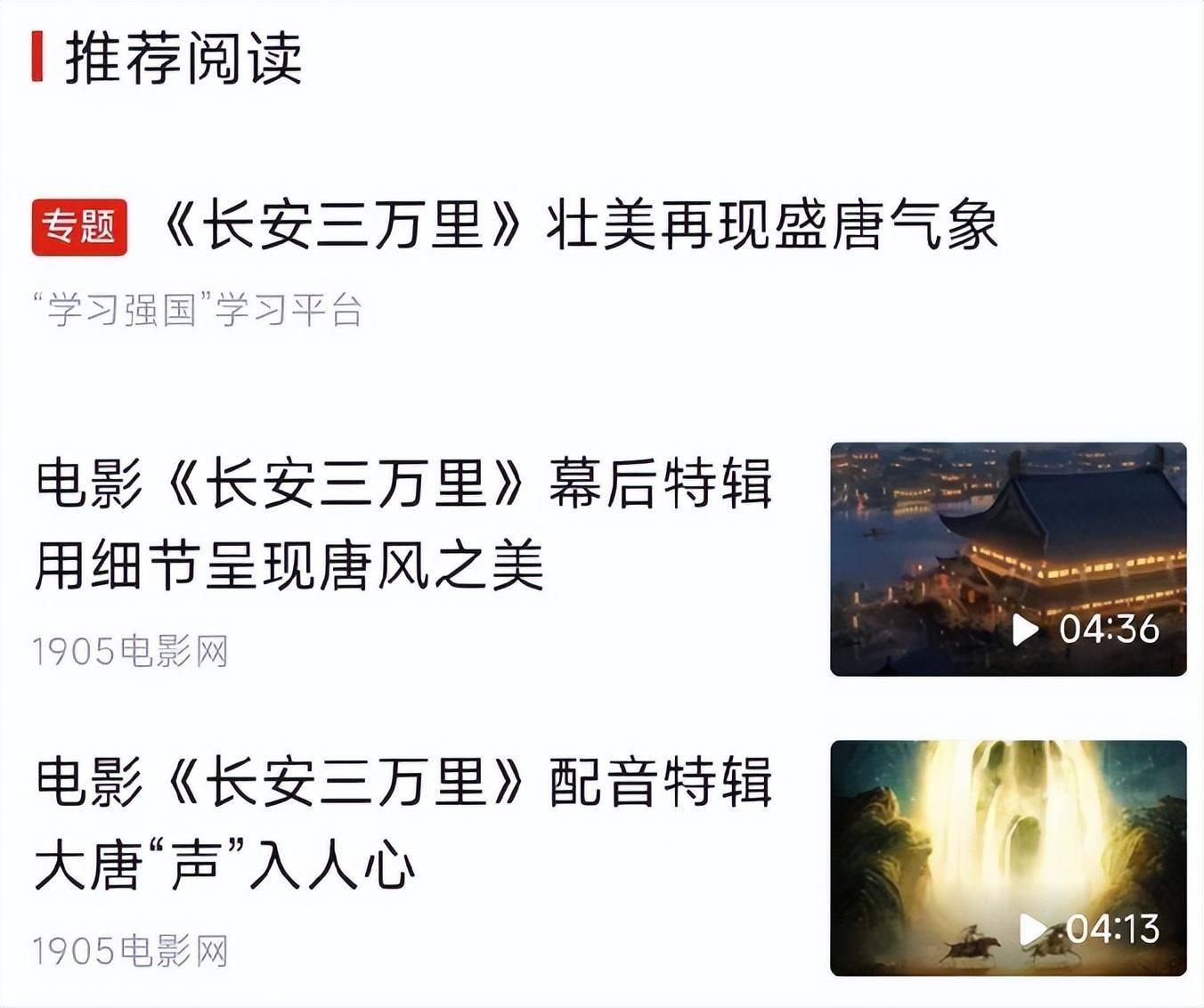 就连国家最高学习平台学习强国上,也有《长安三万里》的专门版块。