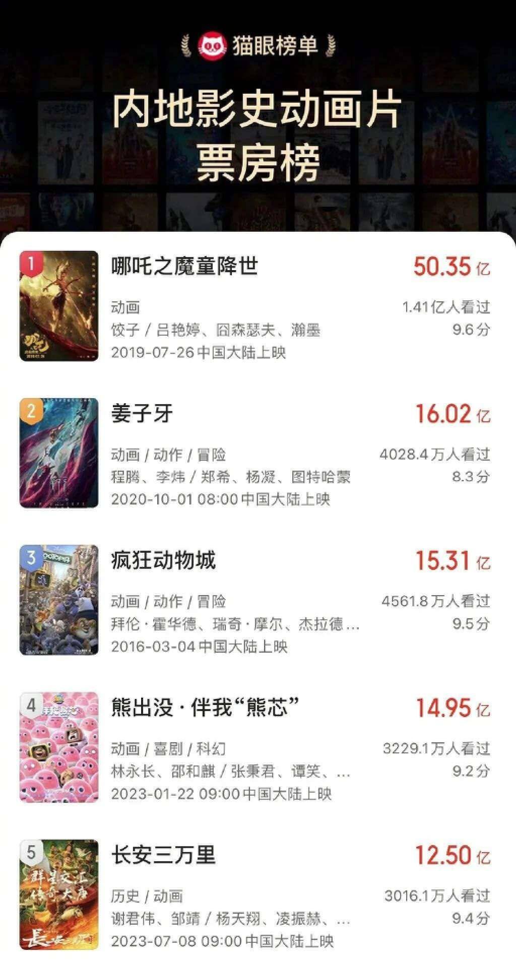24日,《长安三万里》票房突破12.3亿,观影人次突破3000万,超过《寻梦环游记》,正式成为中国影史动画电影票房第五名。