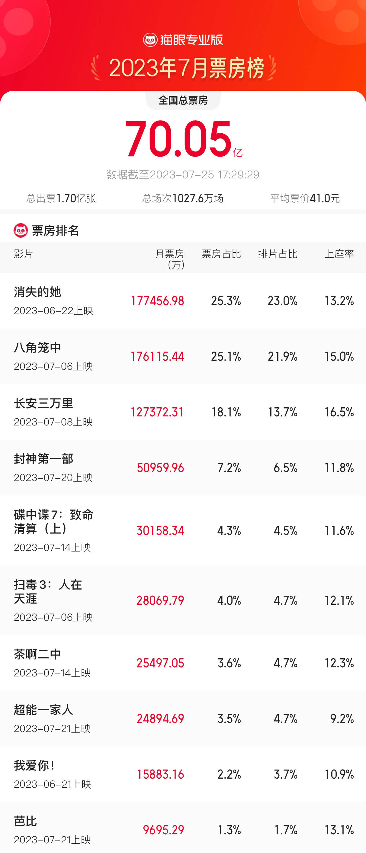搜狐娱乐讯 据猫眼专业版数据,截至7月25日17时,2023年7月总票房(含预售)突破70亿。陈思诚监制、编剧,朱一龙领衔主演的悬疑犯罪电影《消失的她》持续领跑,电影《八角笼中》《长安三万里》分列第二、三位,三部影片7月票房均超过10亿。