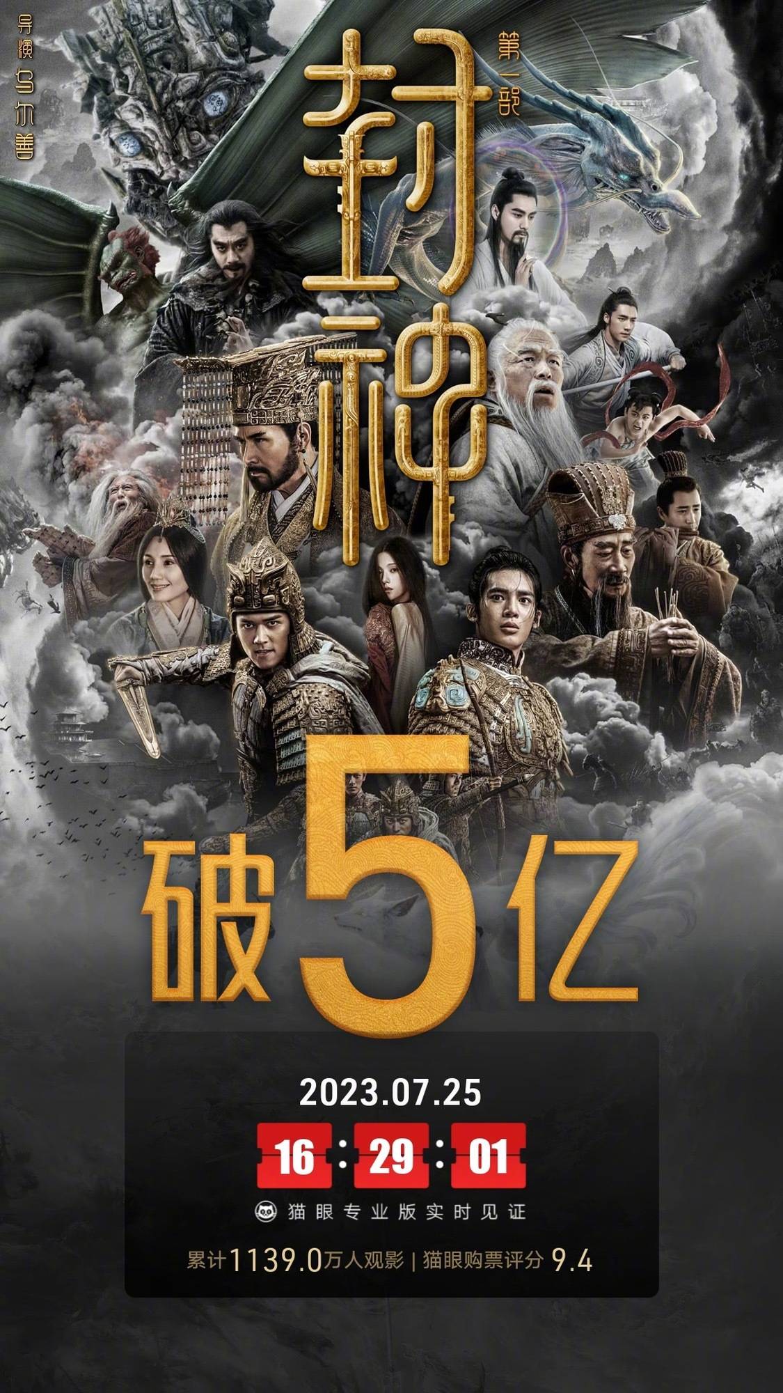 搜狐娱乐讯 据猫眼专业版数据,截至7月25日16:29,乌尔善执导电影《封神第一部》上映第5天 ,累计票房破5亿,累计观影人次1139万,从上周六开始连续四天拿下内地单日票房冠军。