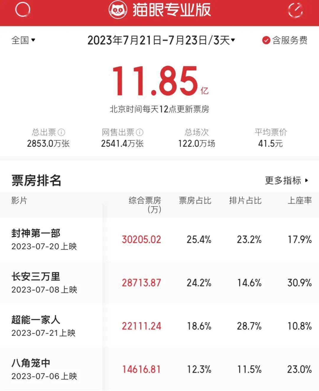 7月23日,《封神第一部》和《长安三万里》仍然是打得难解难分。前者以1.3亿元夺冠,后者以1.29亿元的成绩紧随其后。《超能一家人》5377万元的成绩位列第四,表现还不如《八角笼中》。
