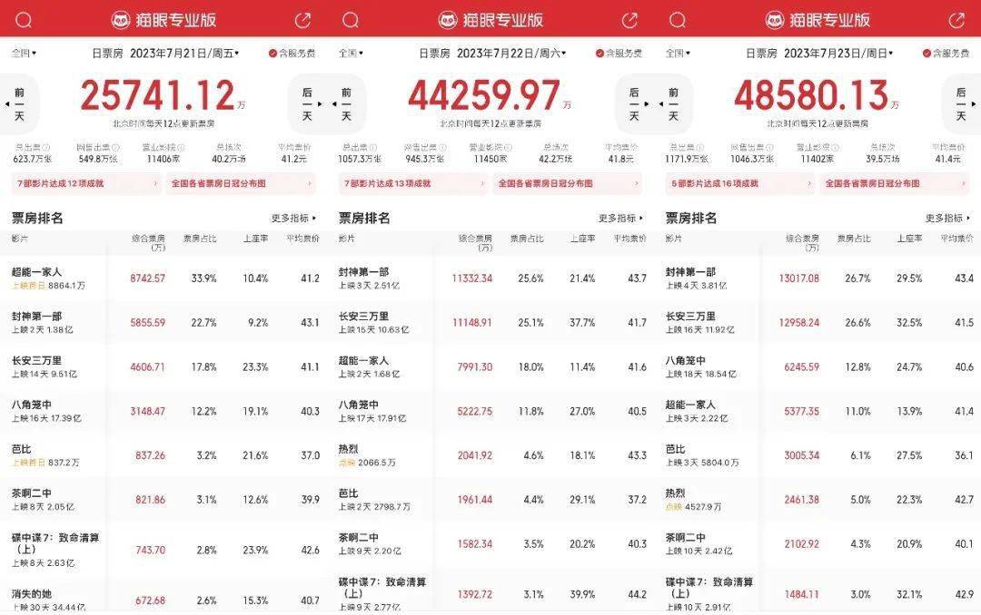 可是,7月22日的市场迎来变局。《封神第一部》以1.13亿元夺得单日冠军,《长安三万里》凭借1.11亿元稳居第二,《超能一家人》7991万元的成绩被甩到第三。