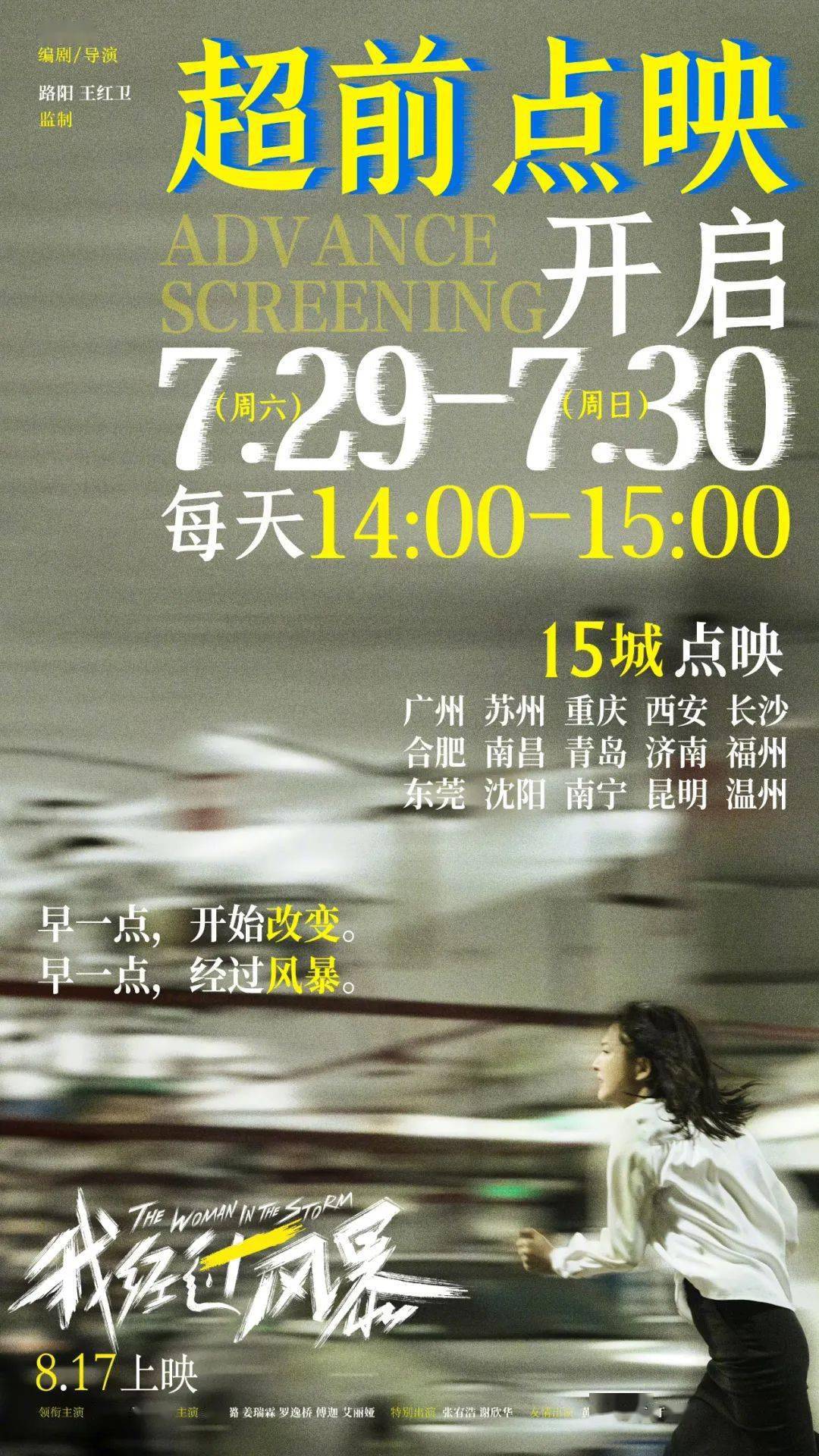 7月24日,电影《我经过风暴》宣布将于7月29日至7月30日每天14点到15点在全国十五城开启超前点映,包括广州、苏州、重庆、西安、长沙、合肥、南昌、青岛等城市。