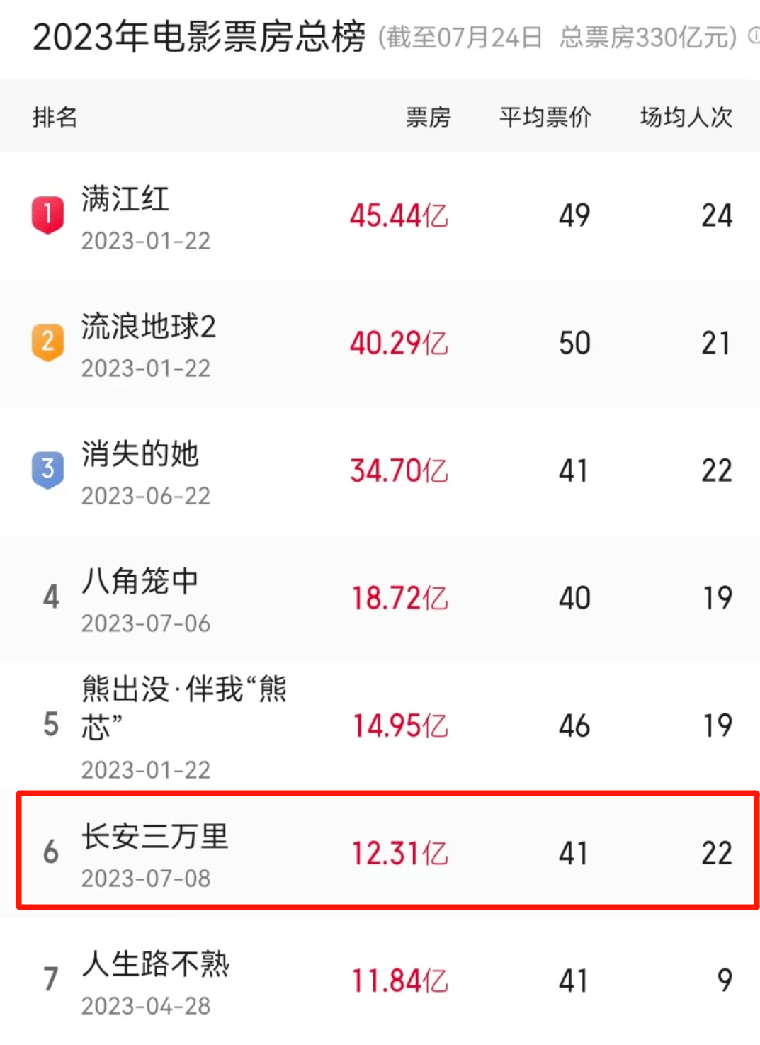 《长安三万里》第三周强势逆跌劲收5.11亿夺周票房冠军。上映17天,累计票房已过12亿,超《人生路不熟》暂居2023年度内地电影票房榜第六位。也是追光动画首部票房破10亿的影片。