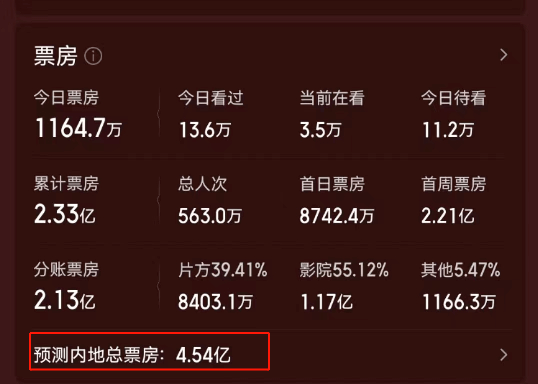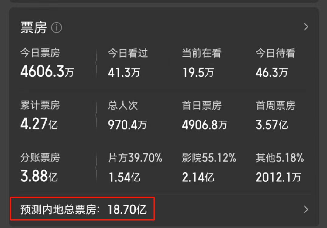上映第五天,累计票房已过4.2亿,猫眼预测总票房从14亿上浮至18.7亿。