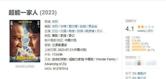艾伦、沈腾主演的国产奇幻喜剧《超能一家人》因质量太差口碑扑街,首周末三天仅收2.21亿排名周票房第四。尴尬失智的笑点、粗制滥造的美术、虚假狂躁的表演,让不少冲着“含腾量”买票进场的观众大失所望,豆瓣评分低至4.1,猫眼预测总票房仅有4.5亿 。
