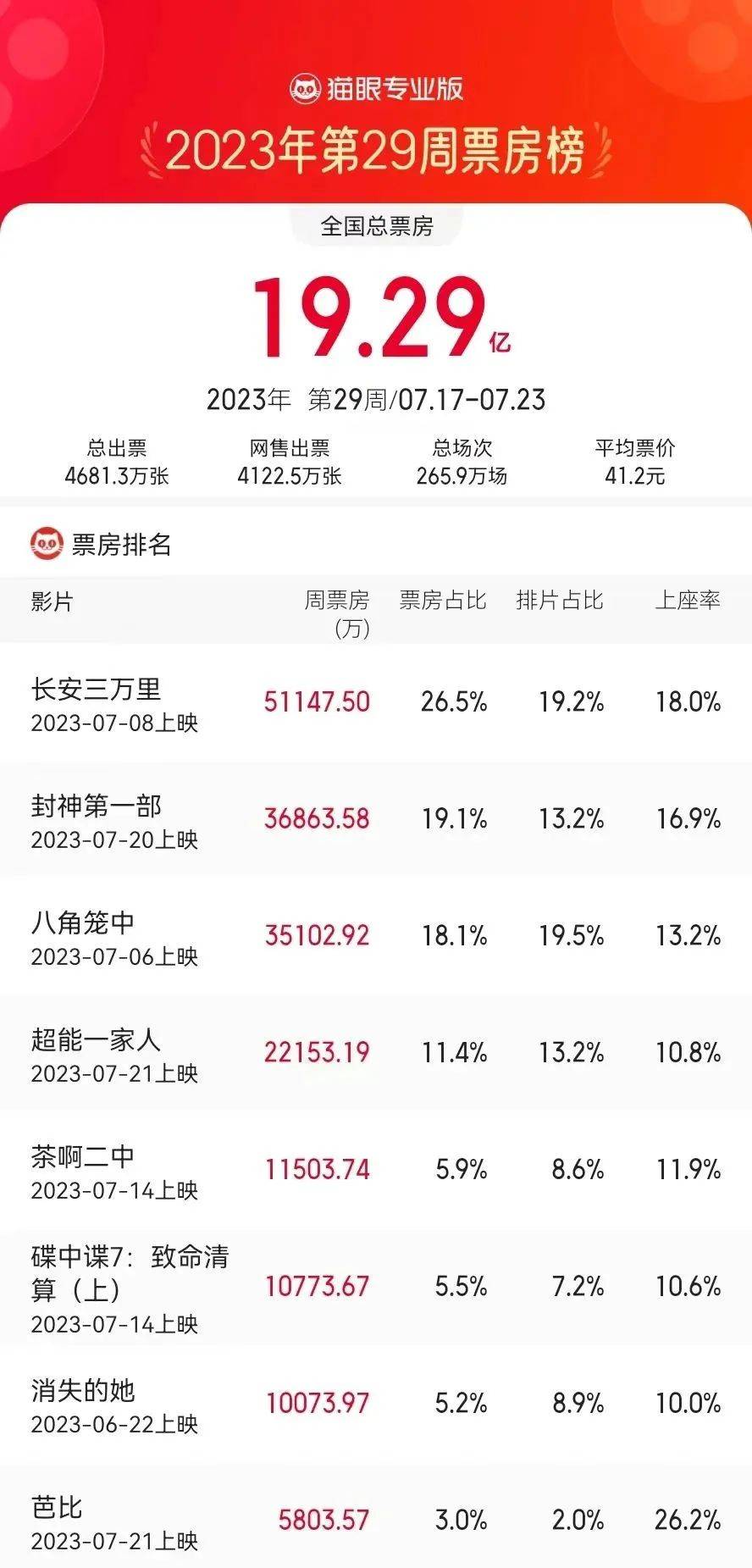 上周多部娱乐新片入场助力大盘升温,据猫眼数据,7.17-7.23内地一周票房报收19.29亿,较前一周的18.57亿小涨3.87%