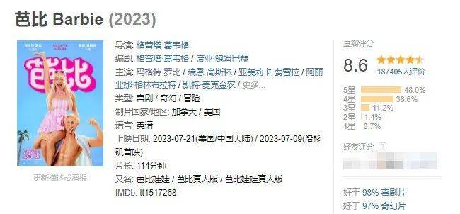 由玛格特·罗比、瑞恩·高斯林主演的好莱坞真人电影《芭比》凭借豆瓣开分8.8的高口碑(现评分为8.6),一大群女性观众 影迷的“自来水”,以及部分男性观众的激烈差评,话题热度持续走高,在排片率仅有2%的劣势下首周末三天进账5803.57万排名第八,表现令人惊喜。