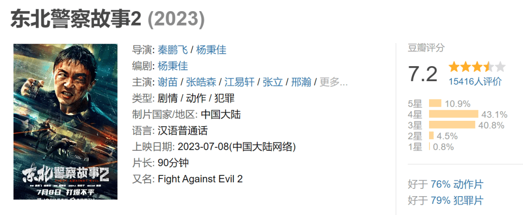 近日,由谢苗等主演的警匪动作片《东北警察故事2》在爱奇艺云影院上线后,单片付费总票房迅速突破1000万。豆瓣上,网友也为该片打出7.2的评分,这在网络电影市场已是非常不错的成绩,甚至有网友感叹:“很久没有见到如此丝滑却又写实的打戏了”、“打得比大多院线电影好看多了”……