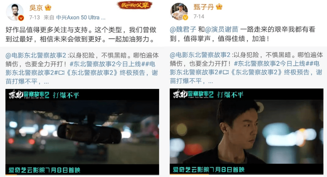 伴随着《东北警察故事2》的口碑持续发酵,吴京、甄子丹、王宝强、张晋、李治廷等演员,大鹏、王晶、刘伟强等多位导演,也纷纷在微博为该片打call,影片随之加速出圈。