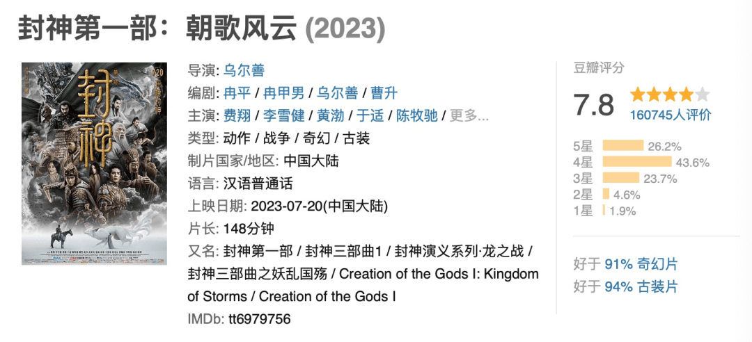 乌尔善的“封神三部曲”第一部,也是搞得有些久,虽然,上映之后似乎并没有达到预期的反响,但是,评分其实还是可以的。