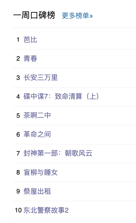 最后,还是例行附上一周豆瓣口碑榜的完整榜单: