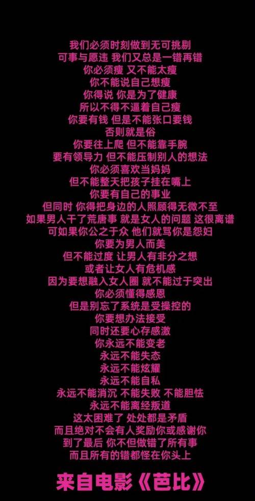 《芭比》不仅仅是一部让观众娱乐放松的电影,更是一部通过幽默诙谐的手法向观众传递女性主义思想的作品,电影以芭比的梦幻世界与现实世界的对比,探讨了性别平等、自我认知和勇敢面对现实的重要性,这种深度和思考使得《芭比》成为一部值得反复品味和思考的入门级别女权主义电影。