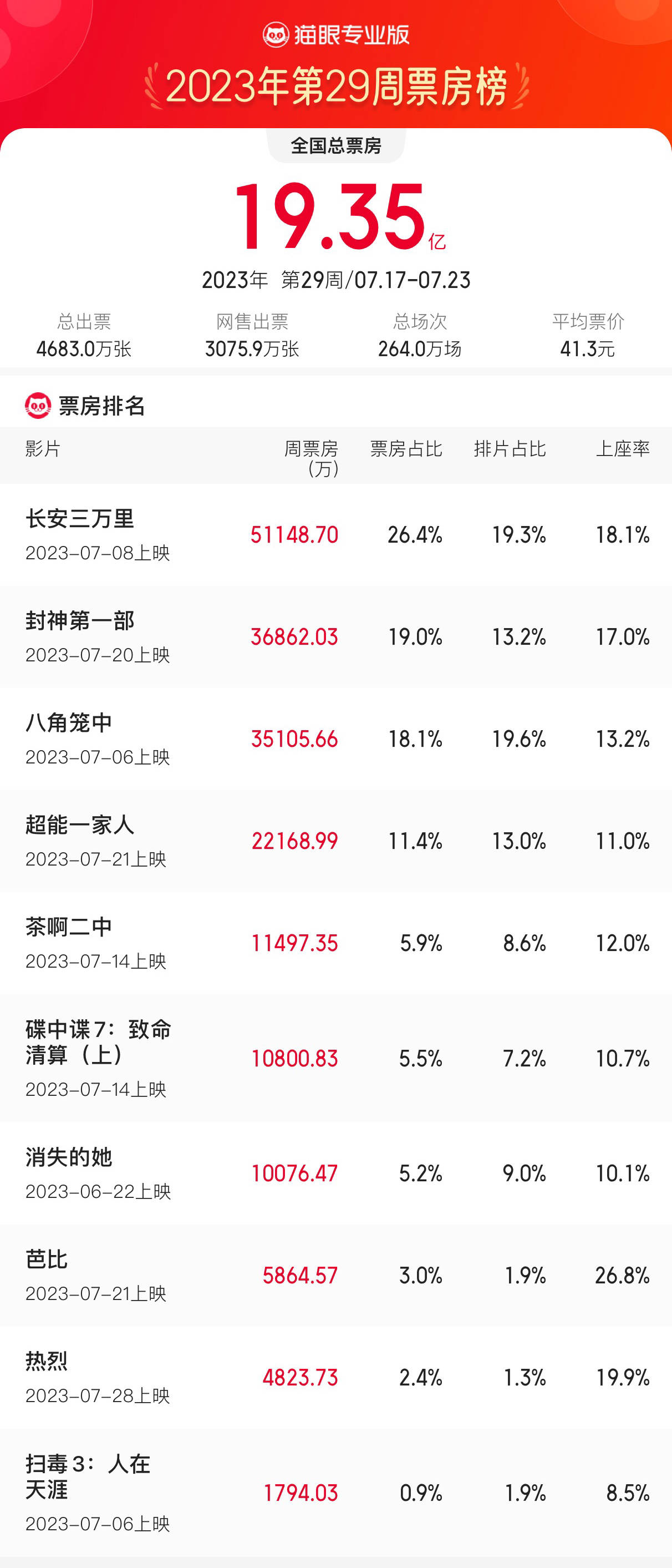 原标题:7.17-7.23内地一周票房19.35亿 《长安三万里》5.11亿夺冠《封神》3.68亿居亚